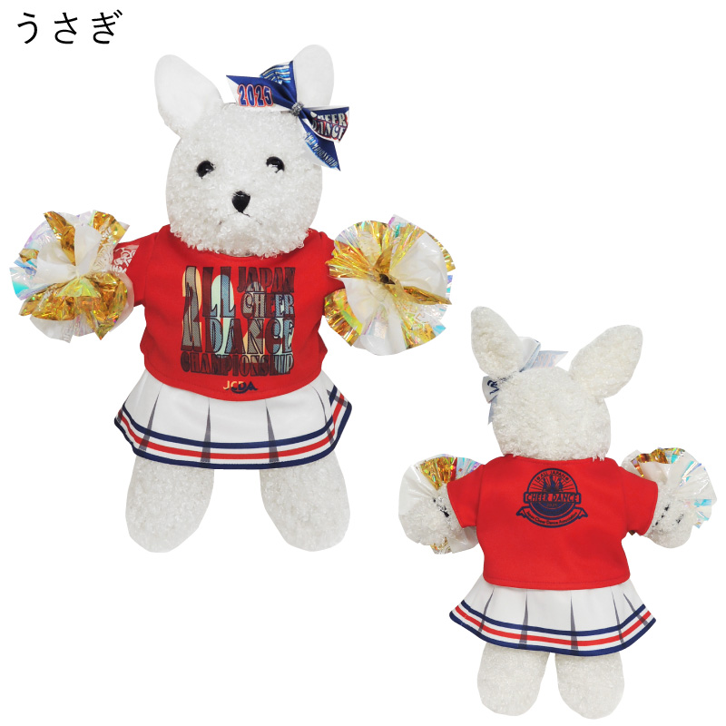 2025大会公式Tシャツを着た、今大会限定デザインのぬいぐるみ。両手にポンポンを持ったチアリーダースタイルです。くま・うさぎを選んでカートに入れてください。