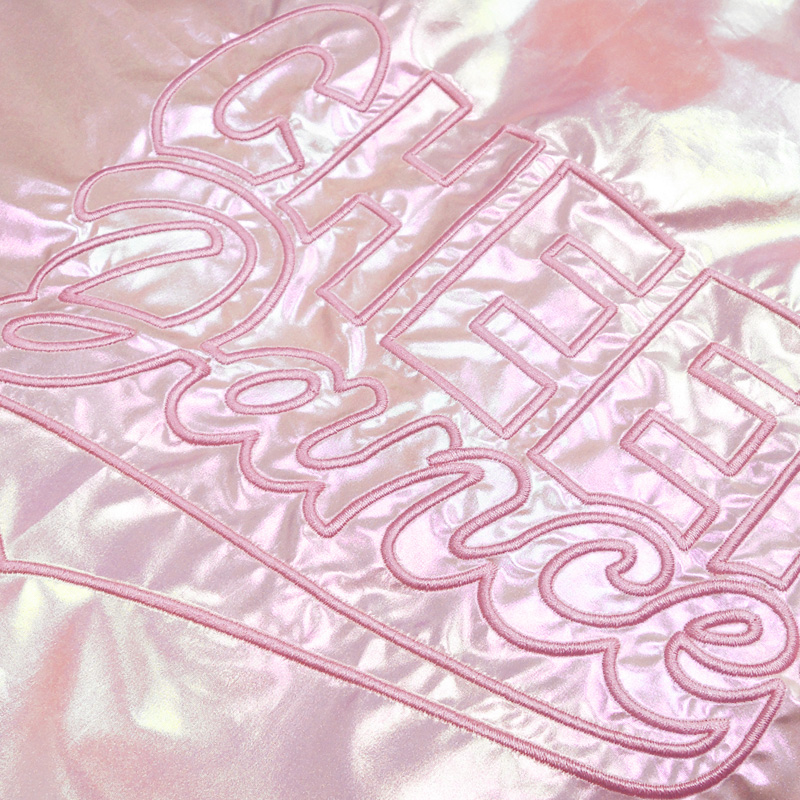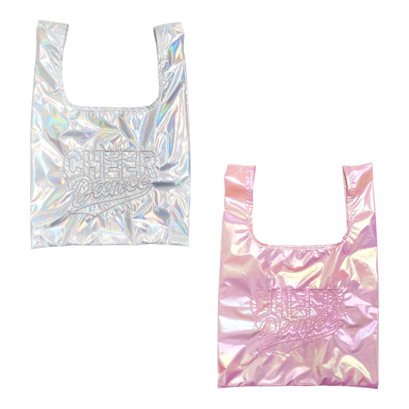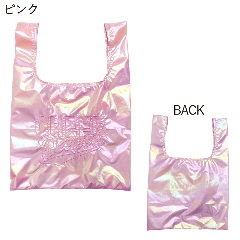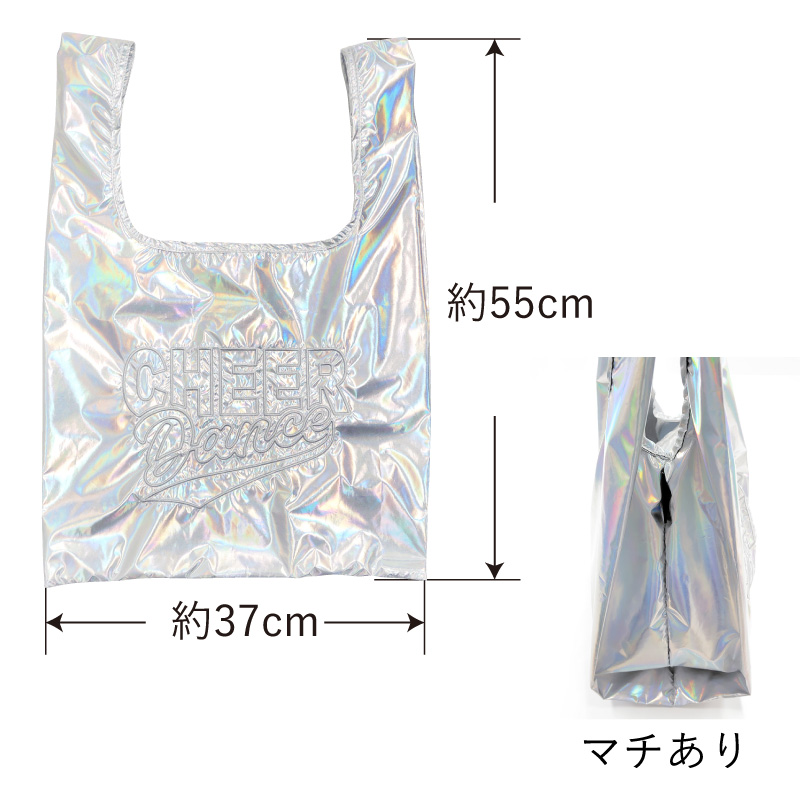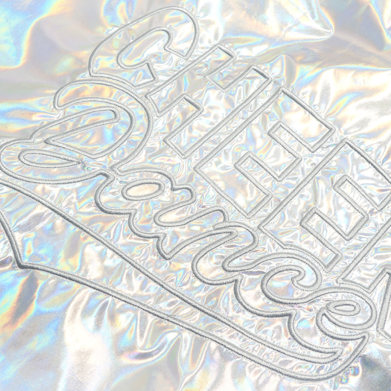 角度によって色が変わって見えるオーロラカラーのバッグ。大きな刺繍ロゴもインパクトがあるデザインです。